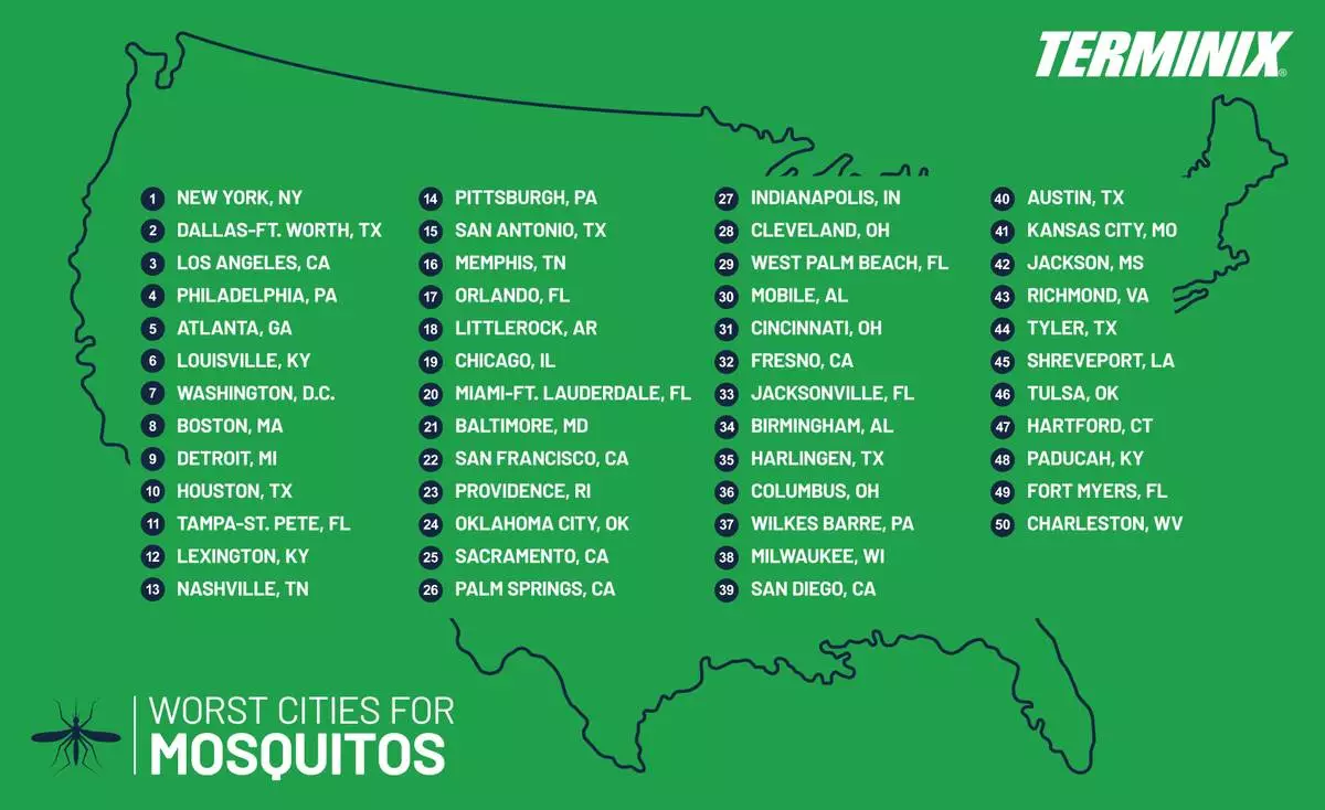 Mosquito activity is expanding beyond its traditional stronghold in the Southern United States, according to new data from Terminix®, a Rentokil Terminix company. Based on 2025 service data from more than 300 Rentokil-owned Terminix branches nationwide,* the company’s annual list of the Top 50 Most Mosquito-Infested Cities reveals shifting patterns driven by prolonged heat, higher humidity, and increased rainfall in regions outside historically high-risk markets.