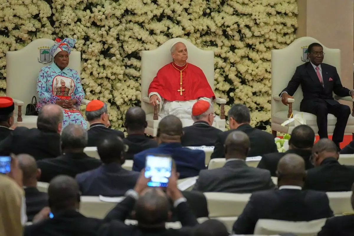 Pope Leo XIV, center, flanked by Equatorial Guinea's President Teodoro Obiang Nguema Mbasogo, left, President's wife Constancia Mangue, meets with the authorities, civil society and the diplomatic corps - epresentatives of the world of culture in Malabo, Equatorial Guinea, Tuesday, April 21, 2026, on the ninth day of his 11-day pastoral visit to Africa. (AP Photo/Andrew Medichini)