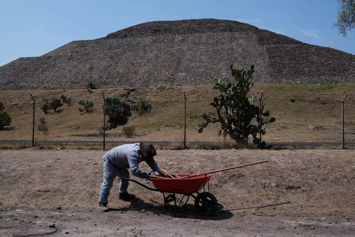 A worker pushes a wheelbarrow at the Teotihuacan pyramids, which remained closed a day after a gunman opened fire on tourists at the archaeological site on the outskirts of Mexico City, Tuesday, April 21, 2026. (AP Photo/Marco Ugarte)