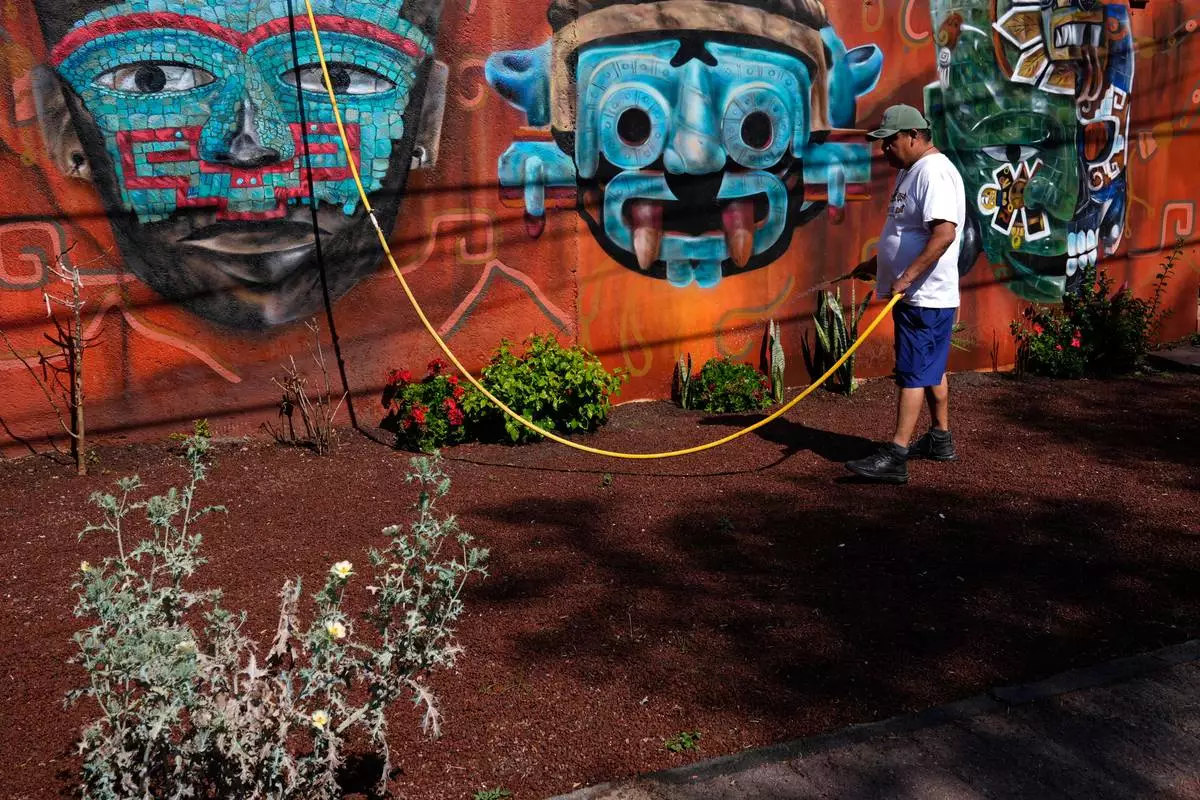 A man waters plants outside a handicrafts shop near the Teotihuacan pyramids, which remained closed a day after a gunman opened fire on tourists at the archaeological site outside Mexico City, Tuesday, April 21, 2026. (AP Photo/Marco Ugarte)