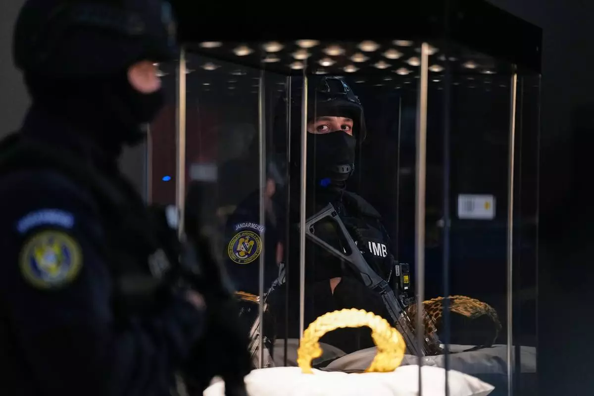 Armed gendarmes stand by Dacian gold items, a 2,500-year-old helmet and wristbands, stolen from a museum in the Netherlands and then recovered by Dutch authorities, during a press conference after being returned, at the National Museum of Romanian History, in Bucharest, Romania, Tuesday, April 21, 2026. (AP Photo/Andreea Alexandru)