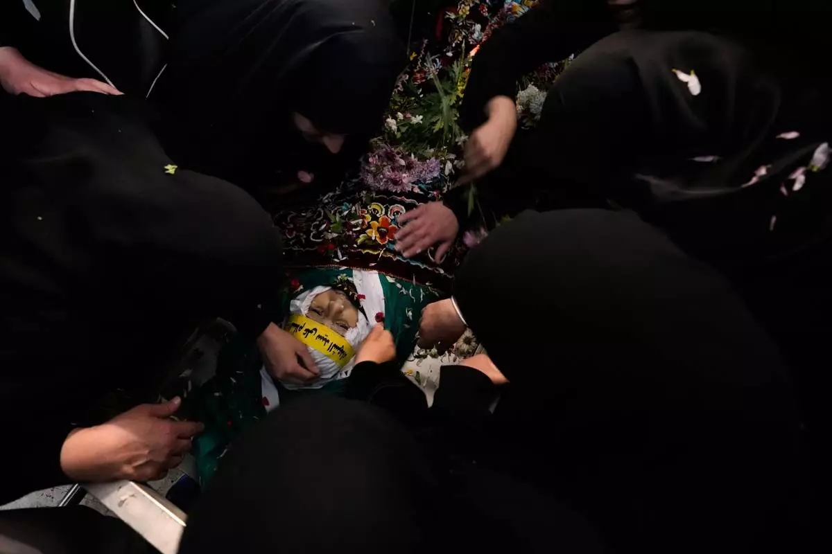 Relatives of Ghadir Baalbaki, 19, who was killed on Tuesday in an Israeli airstrike, mourn during her funeral in the southern port city of Tyre, Lebanon, Wednesday, April 15, 2026. (AP Photo/Hussein Malla)