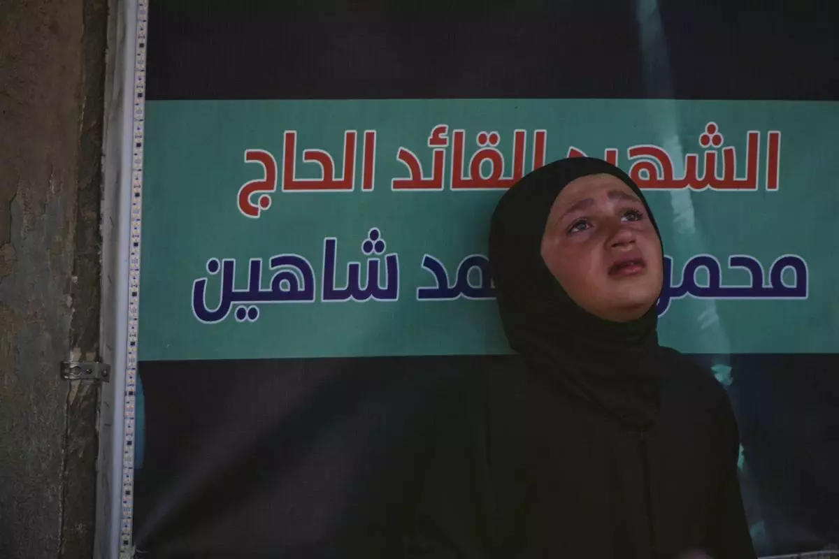 A girl mourns during a mass funeral procession for Hezbollah fighters killed before the ceasefire in the war between Hezbollah and Israel in the southern village of Kfar Sir, Lebanon, Tuesday, April 21, 2026. (AP Photo/Hassan Ammar)