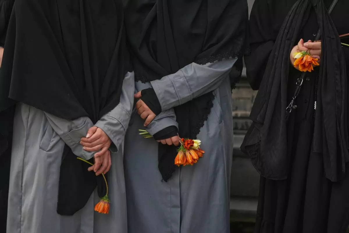 Women hold flowers during a mass funeral procession for Hezbollah fighters killed before the ceasefire in the war with Israel in the southern village of Kfar Sir, Lebanon, Tuesday, April 21, 2026. (AP Photo/Hassan Ammar)