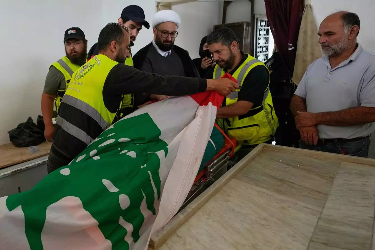 Paramedics cover the body of Ghadir Baalbaki, 19, who was killed on Tuesday in an Israeli airstrike, with a Lebanese flag at a morgue in the southern port city of Tyre, Lebanon, Wednesday, April 15, 2026. (AP Photo/Hussein Malla)