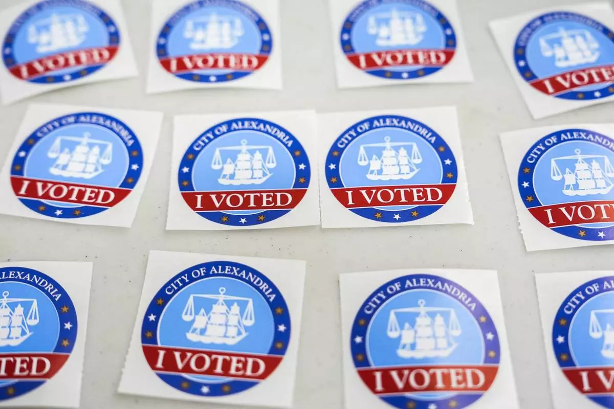 "I Voted" stickers are laid out on a table at Lyles-Crouch Traditional Academy on election day for the Virginia redistricting referendum, Tuesday, April 21, 2026, in Alexandria, Va. (AP Photo/Julia Demaree Nikhinson)