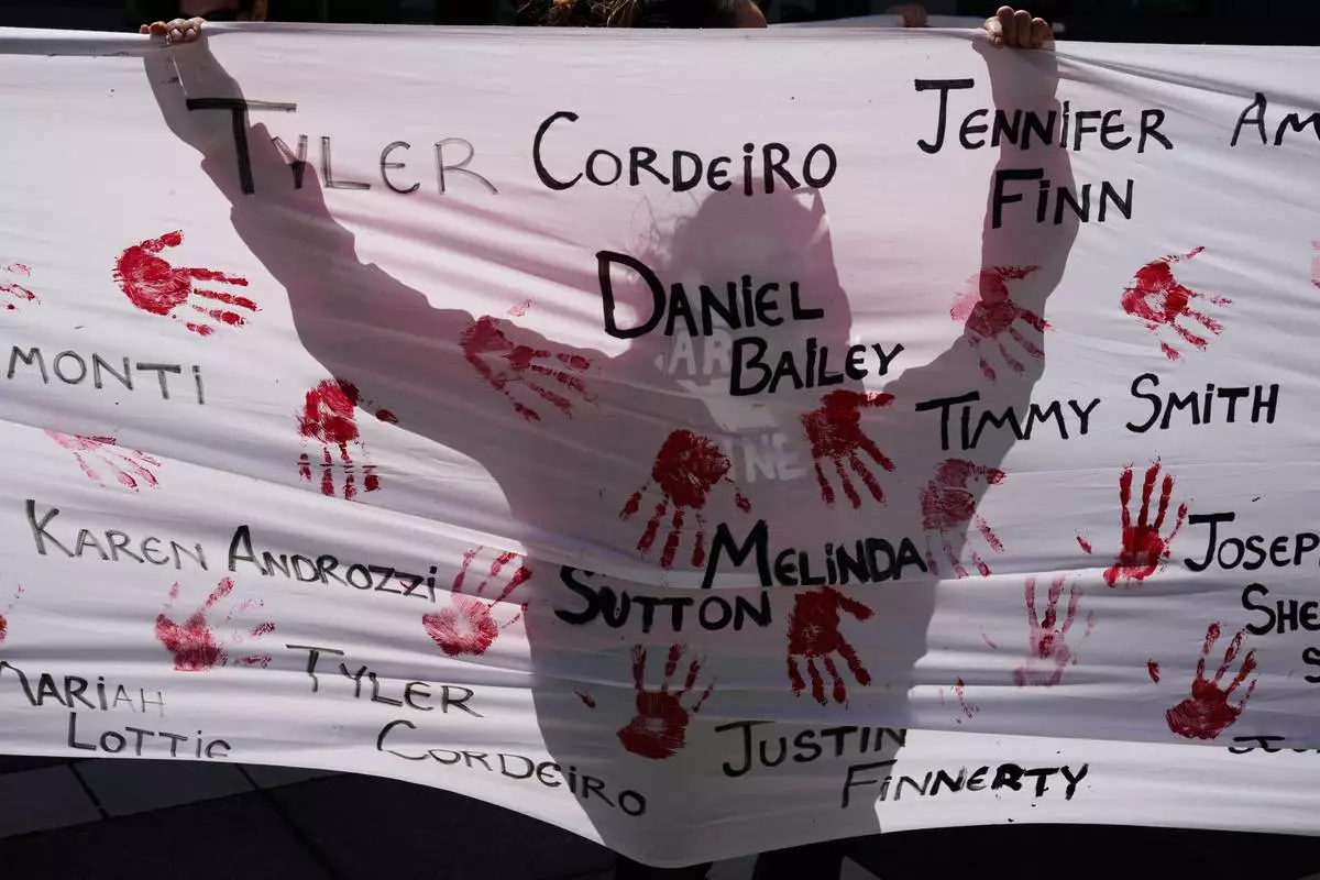 People hold a sign with the names of victims of the opioid crisis while rallying outside of a courthouse in Newark, N.J., Tuesday, April 21, 2026. (AP Photo/Seth Wenig)