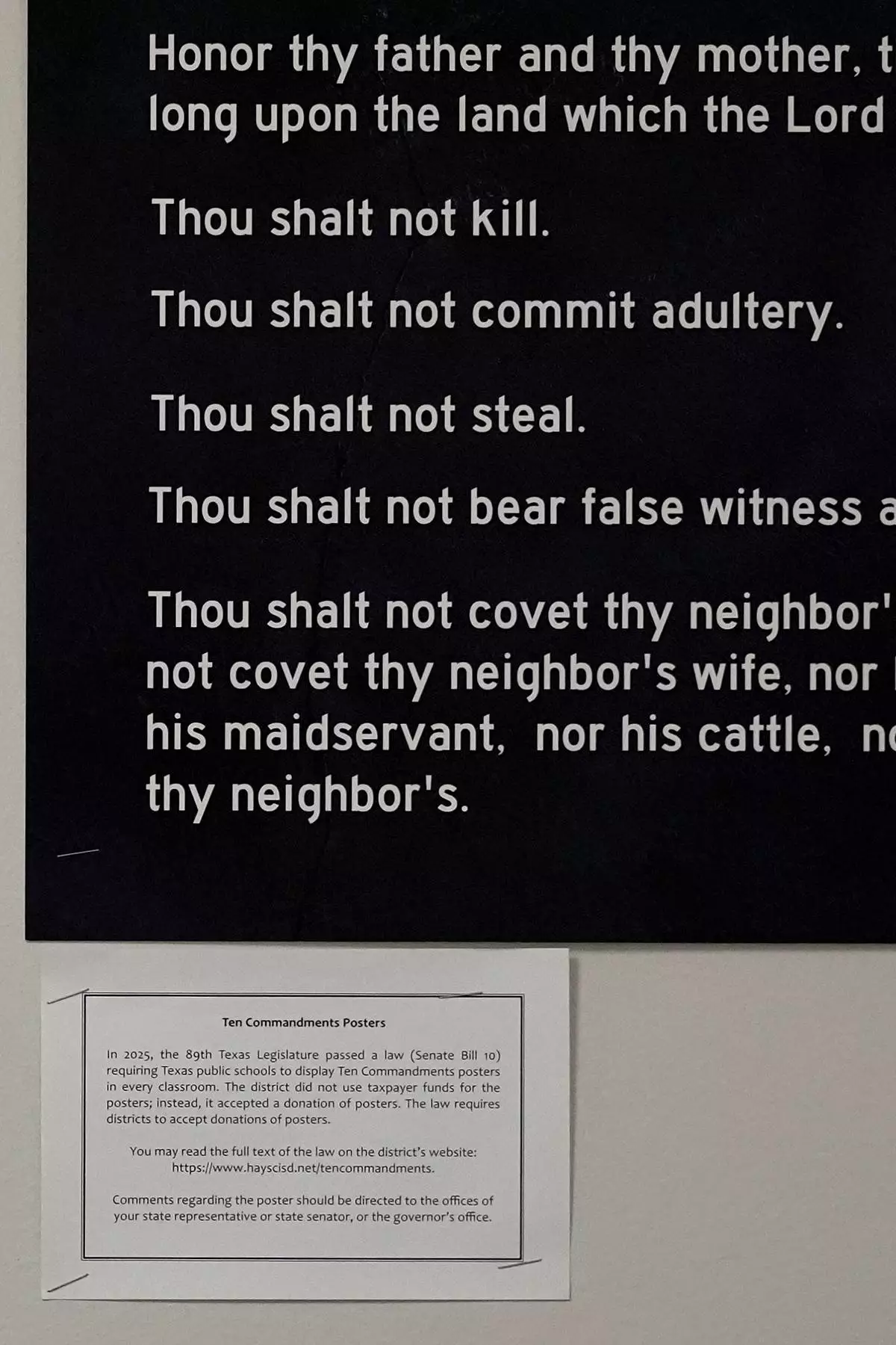 FILE - A Ten Commandments poster and explanation of the state's new law are displayed in a classroom at Lehman High School in Kyle, Texas, Thursday, Oct. 16, 2025. (AP Photo/Eric Gay,File)
