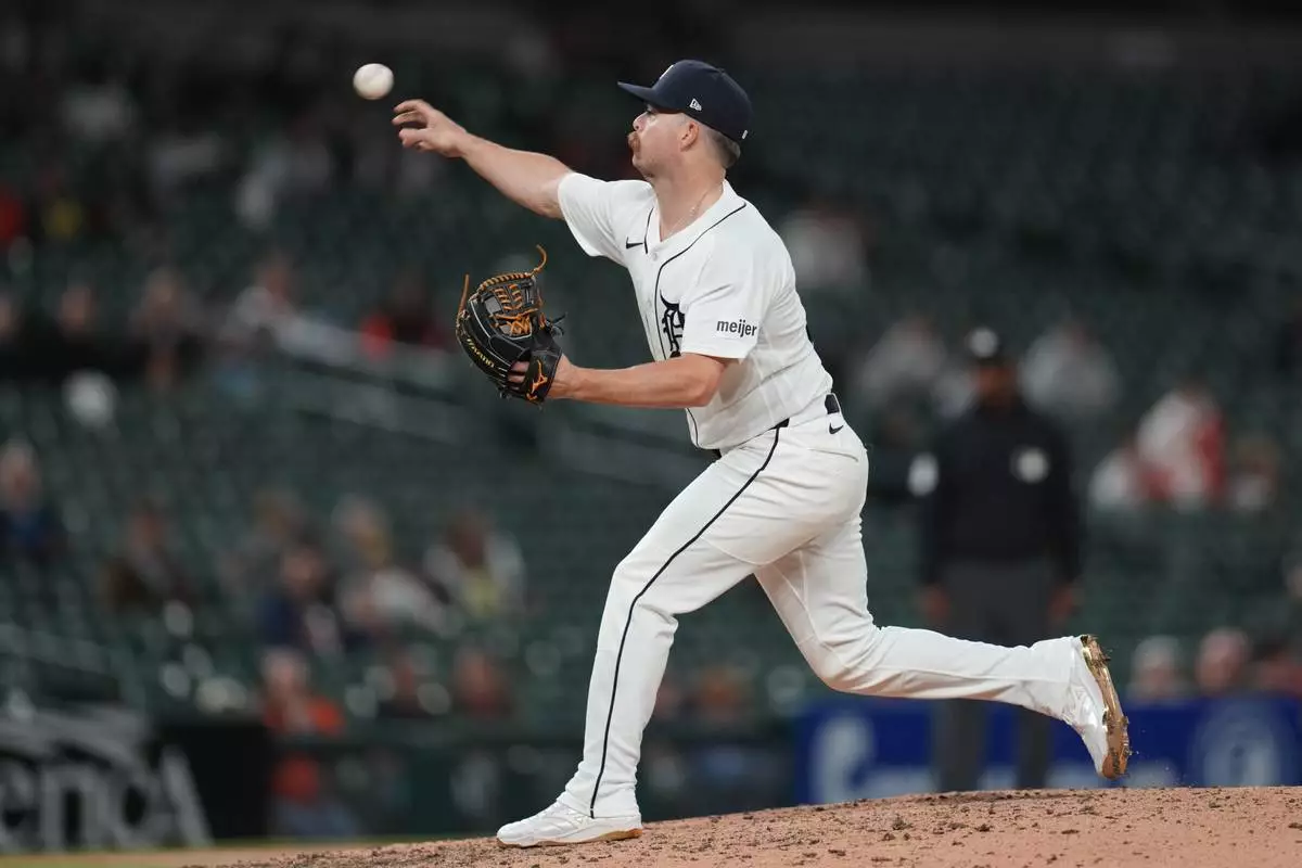 Detroit Tigers' Jake Rogers pitches against the Milwaukee Brewers during the ninth inning of a baseball game Tuesday, April 21, 2026, in Detroit. (AP Photo/Paul Sancya)