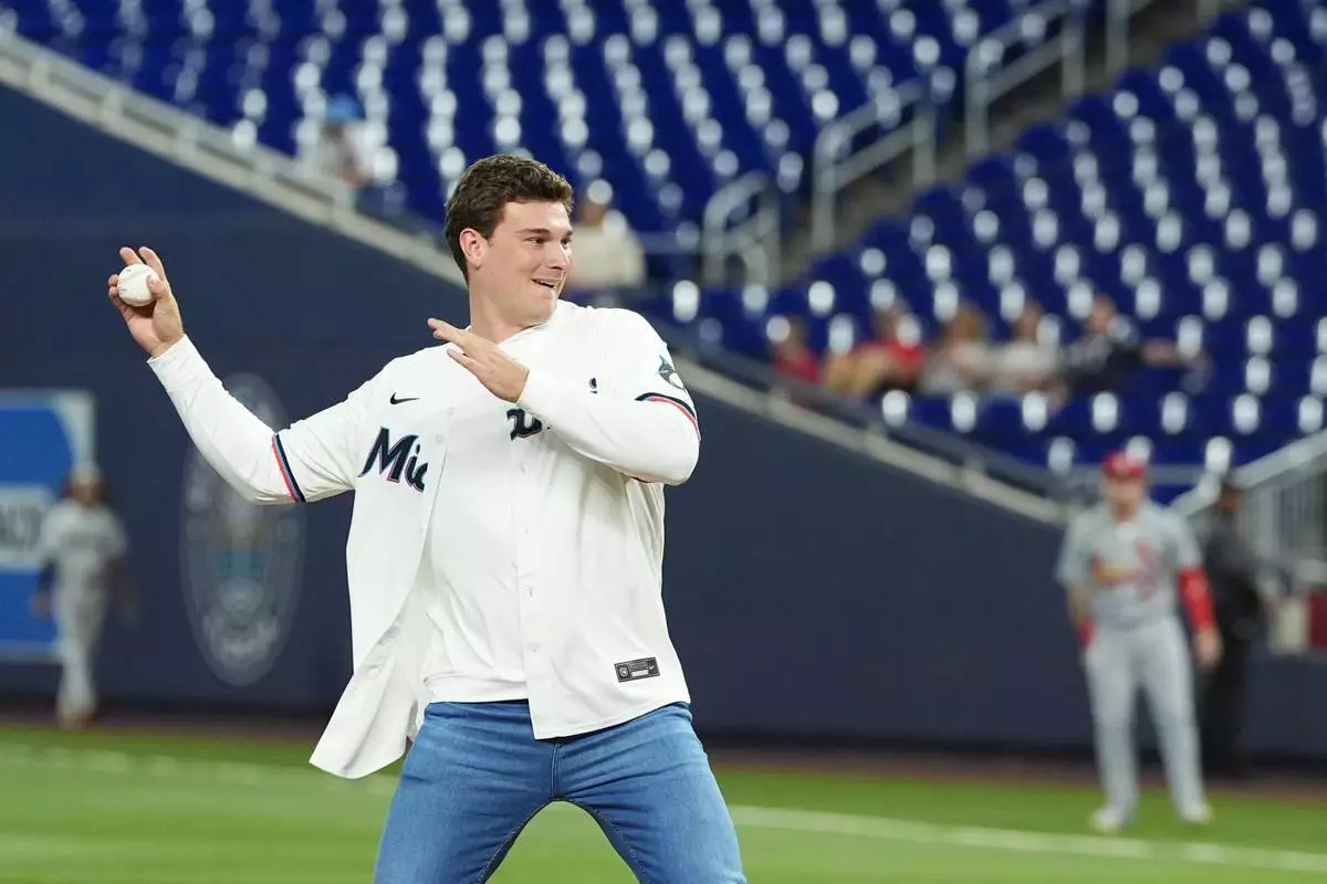 Indiana quarterback Fernando Mendoza throws out the ceremonial first pitch at the start of a baseball game between the Miami Marlins and the St. Louis Cardinals, Tuesday, April 21, 2026, in Miami. (AP Photo/Rebecca Blackwell)