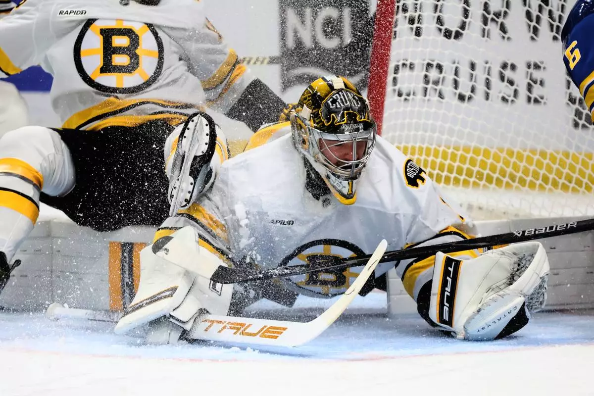 Bowen Byram and Peyton Krebs scored 1:14 apart to cut Boston's lead to 4-2 with 4:52 remaining in regulation before being stymied by Swayman, who stopped the final eight shots he faced.
