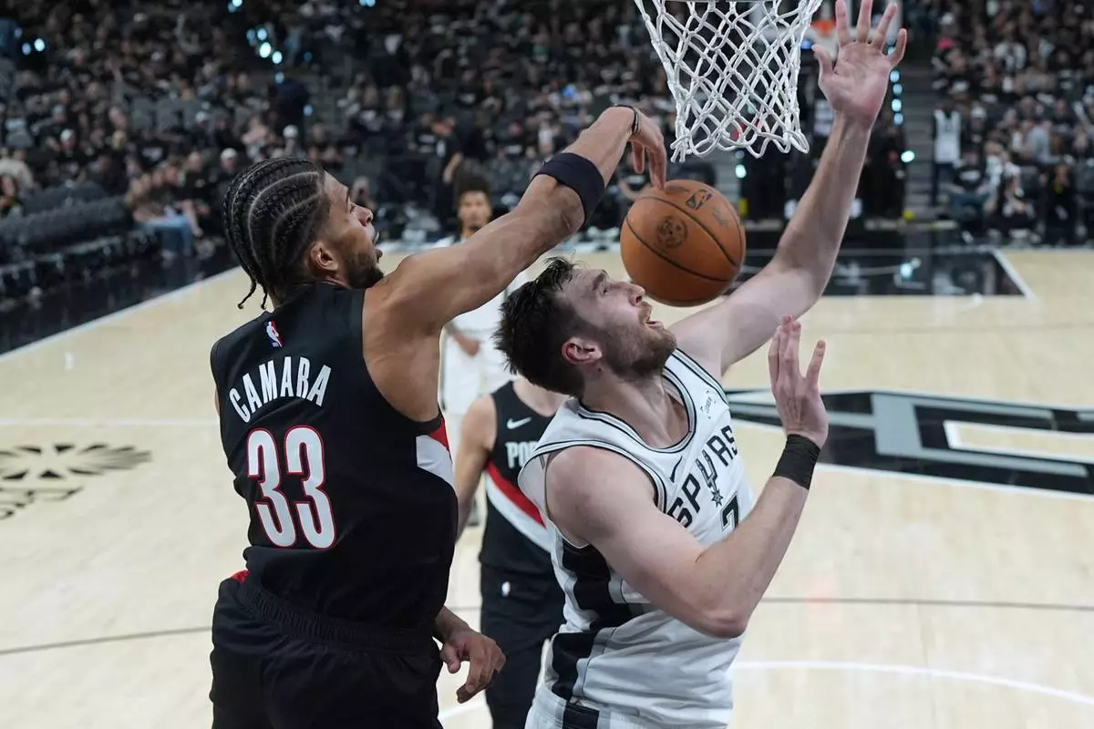 San Antonio Spurs center Luke Kornet (7) is blocked by Portland Trail Blazers forward Toumani Camara (33) during the second half in Game 2 of a first-round NBA playoffs basketball series in San Antonio, Tuesday, April 21, 2026. (AP Photo/Eric Gay)