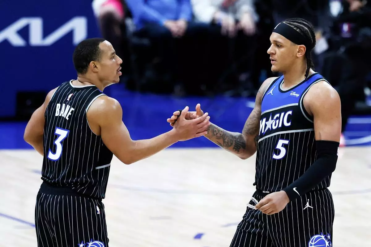 Orlando Magic guard Desmond Bane (3) celebrates with forward Paolo Banchero (5) after a win over the Detroit Pistons in Game 1 of a first-round NBA basketball playoffs series Sunday, April 19, 2026, in Detroit. (AP Photo/Duane Burleson)