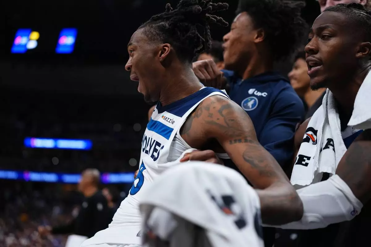 Minnesota Timberwolves guard Bones Hyland (8) celebrates on the bench against the Denver Nuggets during the second half in Game 2 of a first-round NBA playoffs basketball series Monday, April 20, 2026, in Denver. (AP Photo/Jack Dempsey)