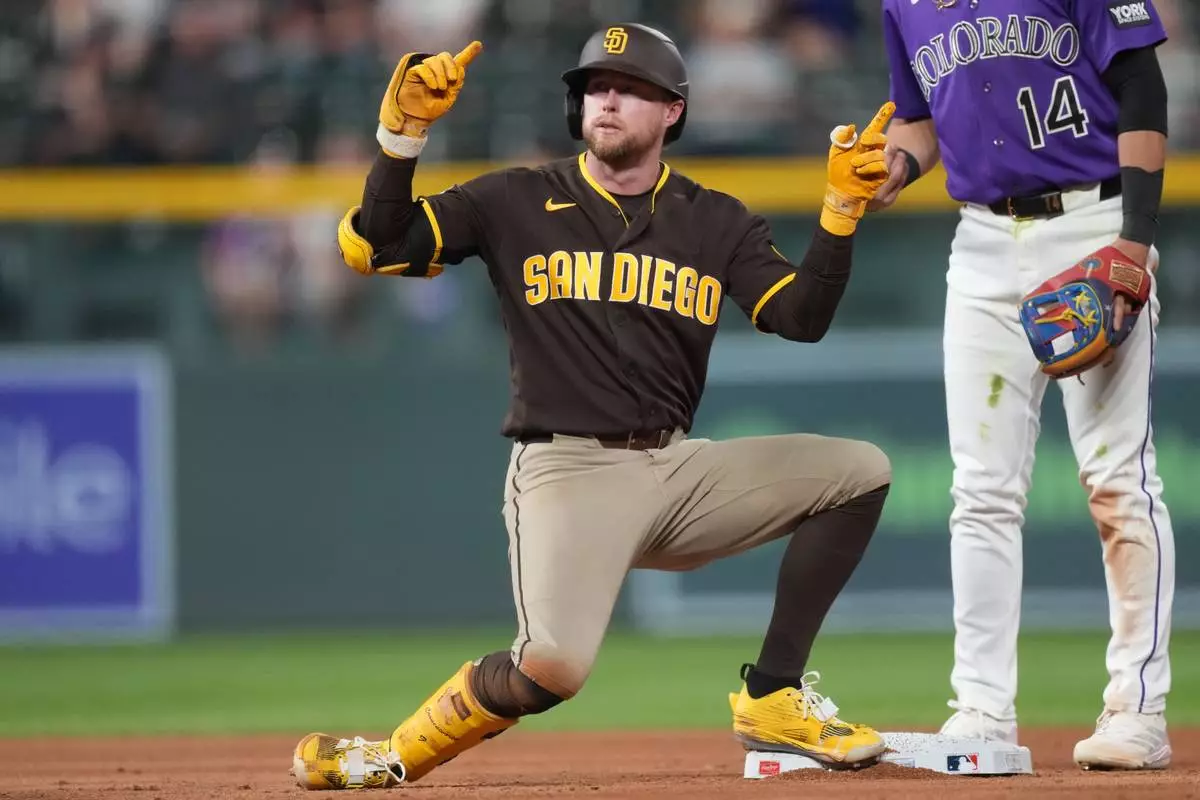 San Diego Padres' Jake Cronenworth gestures after reaching second base on a double off Colorado Rockies relief pitcher Chase Dollander in the sixth inning of a baseball game Tuesday, April 21, 2026, in Denver. (AP Photo/David Zalubowski)