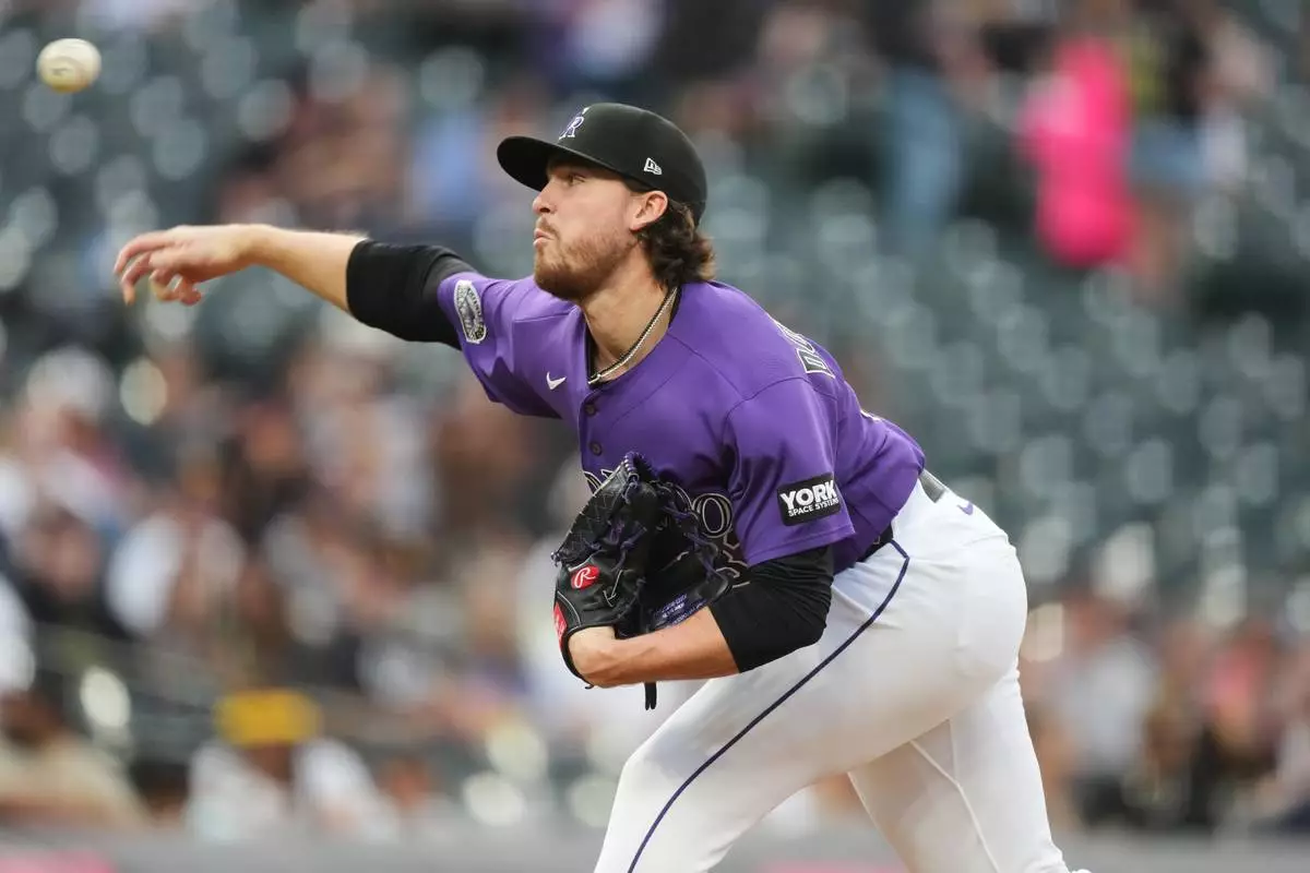 Colorado Rockies relief pitcher Chase Dollander works against the San Diego Padres in the second inning of a baseball game Tuesday, April 21, 2026, in Denver. (AP Photo/David Zalubowski)