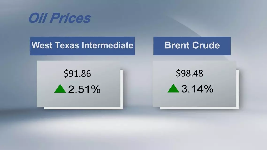 At the close of Tuesday's trading sessions, West Texas Intermediate crude for June delivery surged 2.51 percent to settle at 91.86 U.S. dollars per barrel on the New York Mercantile Exchange, while Brent crude for June delivery gained 3.14 percent to settle at 98.48 dollars per barrel on the London ICE Futures Exchange.