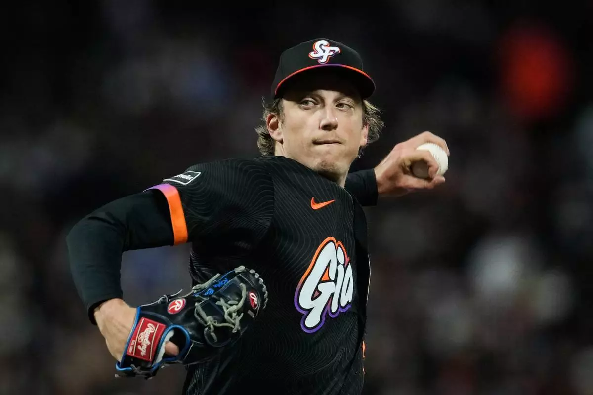 San Francisco Giants' Ryan Borucki pitches to a Los Angeles Dodgers batter during the sixth inning of a baseball game Tuesday, April 21, 2026, in San Francisco. (AP Photo/Godofredo A. Vásquez)