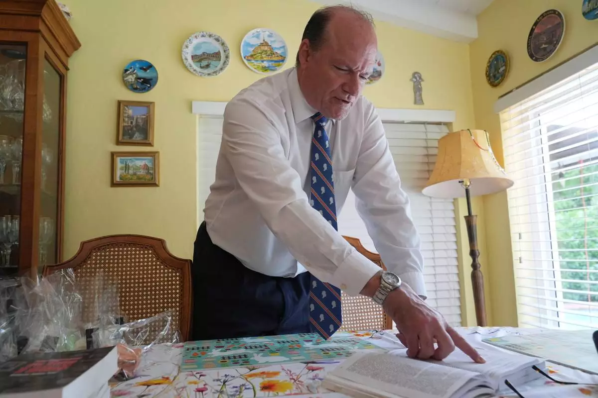Nick Gutiérrez, President of the National Association of Cuban Landowners in Exile, shows a book published by the Cuban government of private properties they seized, Tuesday, April 21, 2026, in Coral Gables, Fla. (AP Photo/Marta Lavandier)