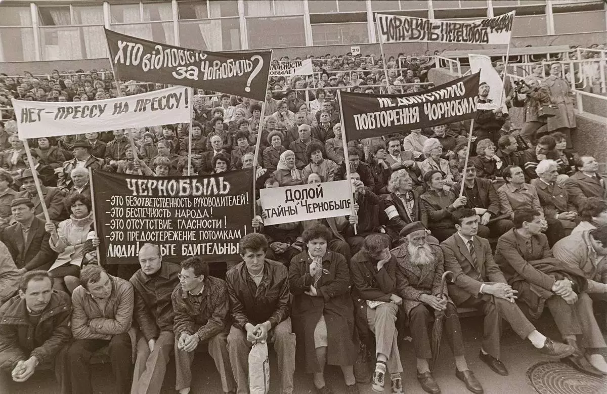 People hold signs reading "Down with the Chernobyl mysteries!" and "Who is responsible for Chernobyl?" during a protest rally demanding the truth about the Chernobyl nuclear power plant accident at a stadium in Chernobyl, Ukraine, April 26, 1989, on the third anniversary of the disaster. (AP Photo/Efrem Lukatsky)