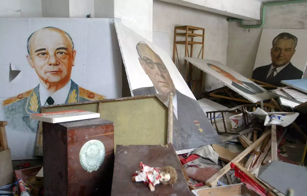 FILE - Portraits of Soviet officials covered by radioactive dust sit in a city club in Pripyat, Ukraine, April 10, 2006, where Chernobyl nuclear power plant workers lived and were evacuated after the deadly explosion and fire. (AP Photo/Efrem Lukatsky, File)