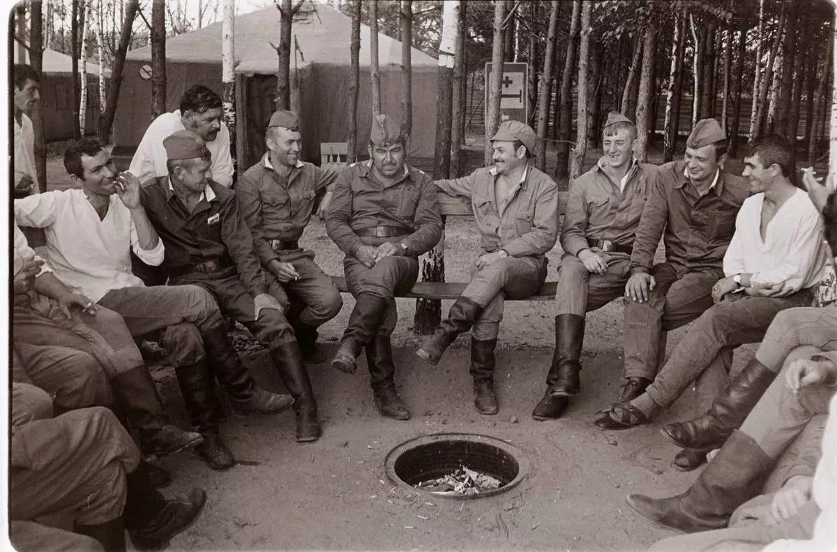 Soldiers taking part in cleanup operations following the Chernobyl power plant explosion rest in a tent camp inside the "exclusion zone" in the autumn of 1986, in Chernobyl, Ukraine. (AP Photo/Efrem Lukatsky)