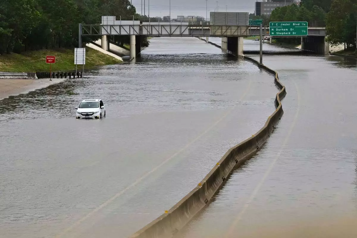 FILE - A vehicle is stranded in high waters on a flooded highway at Interstate 10 and Washington in Houston, July 8, 2024, after Hurricane Beryl came ashore. (AP Photo/Maria Lysaker, File)