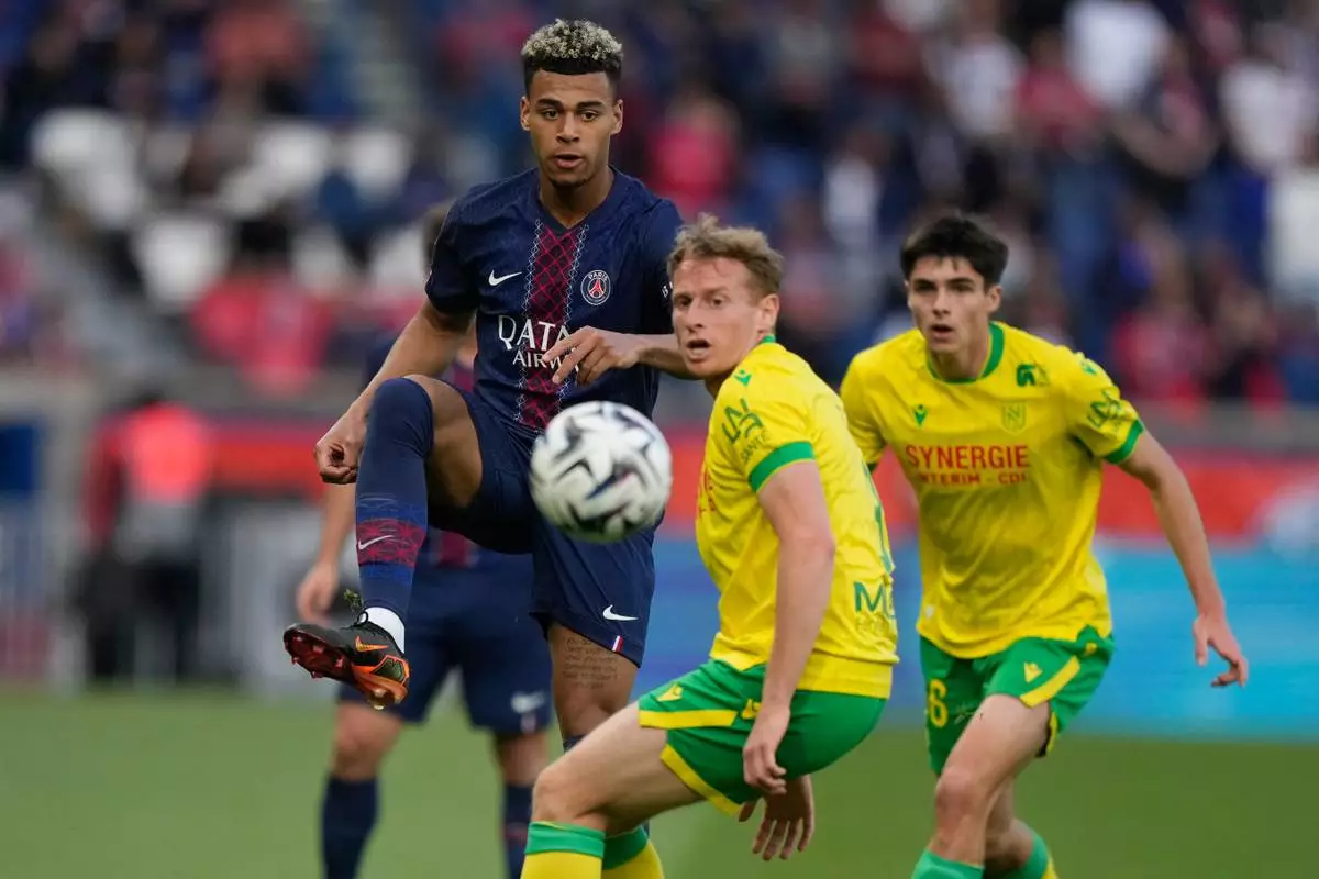 PSG's Warren Zaire-Emery, left, challenge with Nantes' Matthis Abline during the French League One soccer match between Paris Saint-Germain and Nantes in Paris, France, Wednesday, April 22, 2026. (AP Photo/Michel Euler)