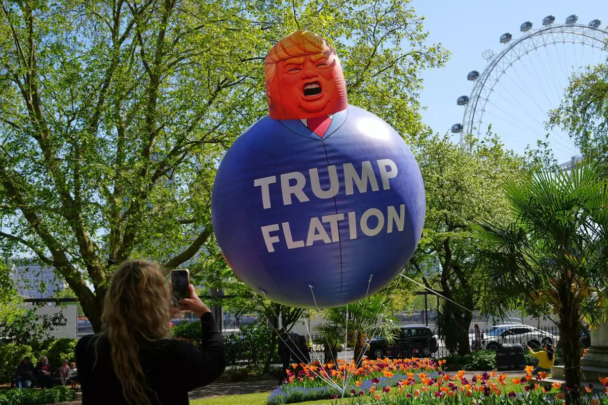 A passer-by takes a picture of a balloon in the caricature of US President Donald Trump as Britain's Liberal Democrat party launch their new "Trumpflation" campaign as latest inflation figures reveal the impact of the Iran War on prices in the UK, in London, Wednesday, April 22, 2026. (AP Photo/Kirsty Wigglesworth)