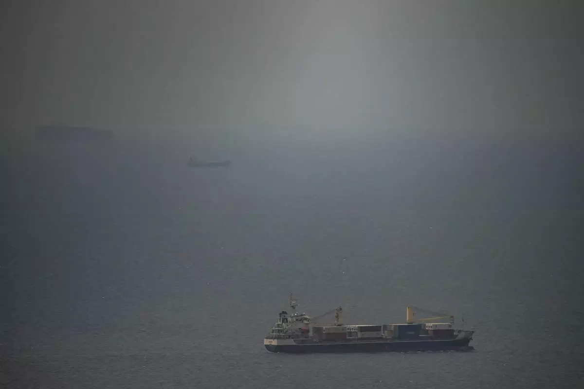 A cargo ship sails in the Persian Gulf toward the Strait of Hormuz, Wednesday, April 22, 2026. (AP Photo)