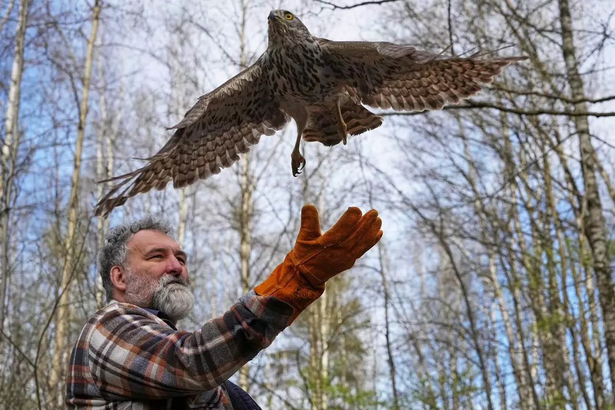 Vladimir Romanov, the founder of the bird hospital 'Green Parrot', releases a hawk that has been restored to health at his hospital, marking the Earth Day on the outskirts of St. Petersburg, Russia, Wednesday, April 22, 2026. (AP Photo/Dmitri Lovetsky)