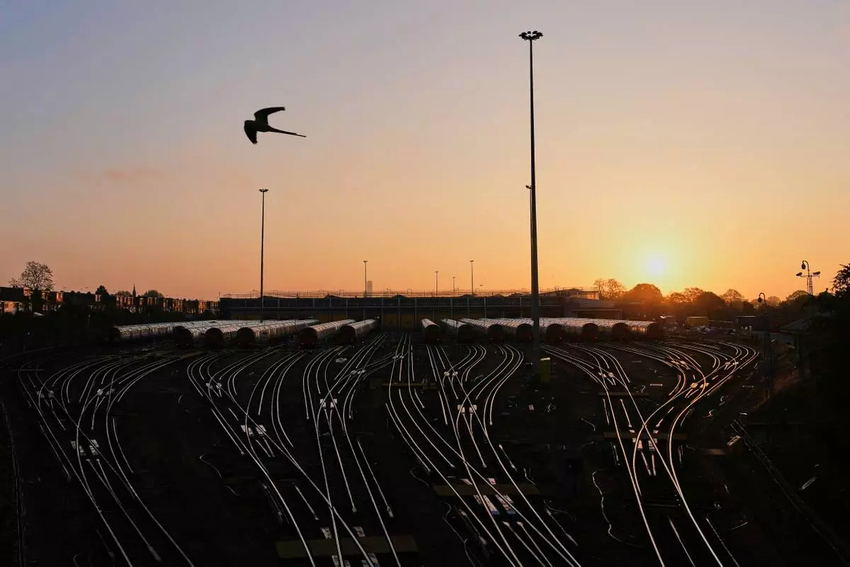 Piccadilly line trains are parked in a depot as RMT Union (The National Union of Rail, Maritime and Transport Workers) drivers are on a 24-hour Tube strike in London, Wednesday, April 22, 2026. (AP Photo/Frank Augstein)
