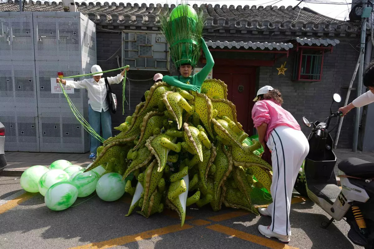 Chinese artiste Kong Ning wears a costumes assembled with dinosaur balloons to commemorate Earth Day in Beijing, Wednesday, April 22, 2026. (AP Photo/Ng Han Guan)