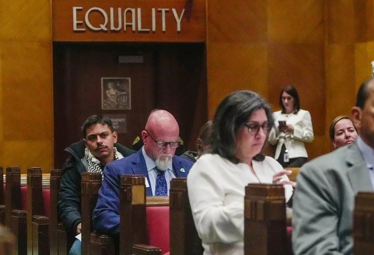 Members of the public listen during a City Council meeting considering whether to repeal a newly approved proposal limiting cooperation with U.S. Immigration and Customs Enforcement at City Hall, in Houston, Wednesday, April 22, 2026. (Raquel Natalicchio/Houston Chronicle via AP)