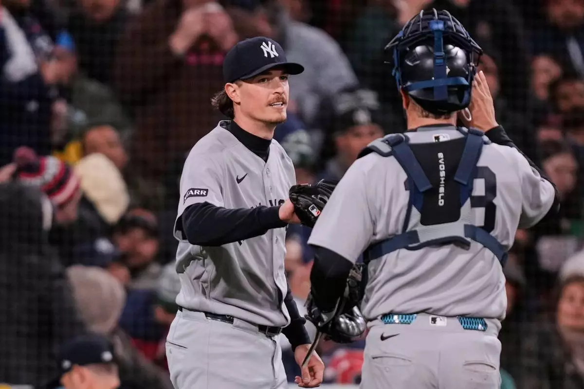 New York Yankees pitcher Max Fried, left, congratulates catcher Austin Wells after completing the sixth inning of a baseball game against the Boston Red Sox at Fenway Park, Wednesday, April 22, 2026, in Boston. (AP Photo/Charles Krupa)