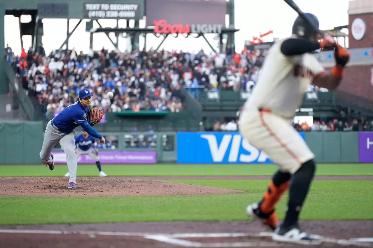 Los Angeles Dodgers pitcher Shohei Ohtani throws to a San Francisco Giants batter during the fifth inning of a baseball game Wednesday, April 22, 2026, in San Francisco. (AP Photo/Tony Avelar)
