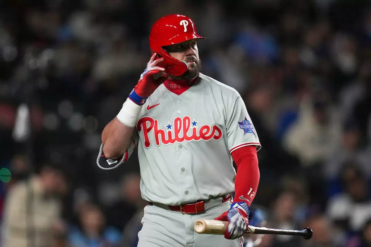 Philadelphia Phillies' Kyle Schwarber (12) returns to the dugout after striking out during the seventh inning of a baseball game against the Chicago Cubs, Wednesday, April 22, 2026, in Chicago. (AP Photo/Erin Hooley)