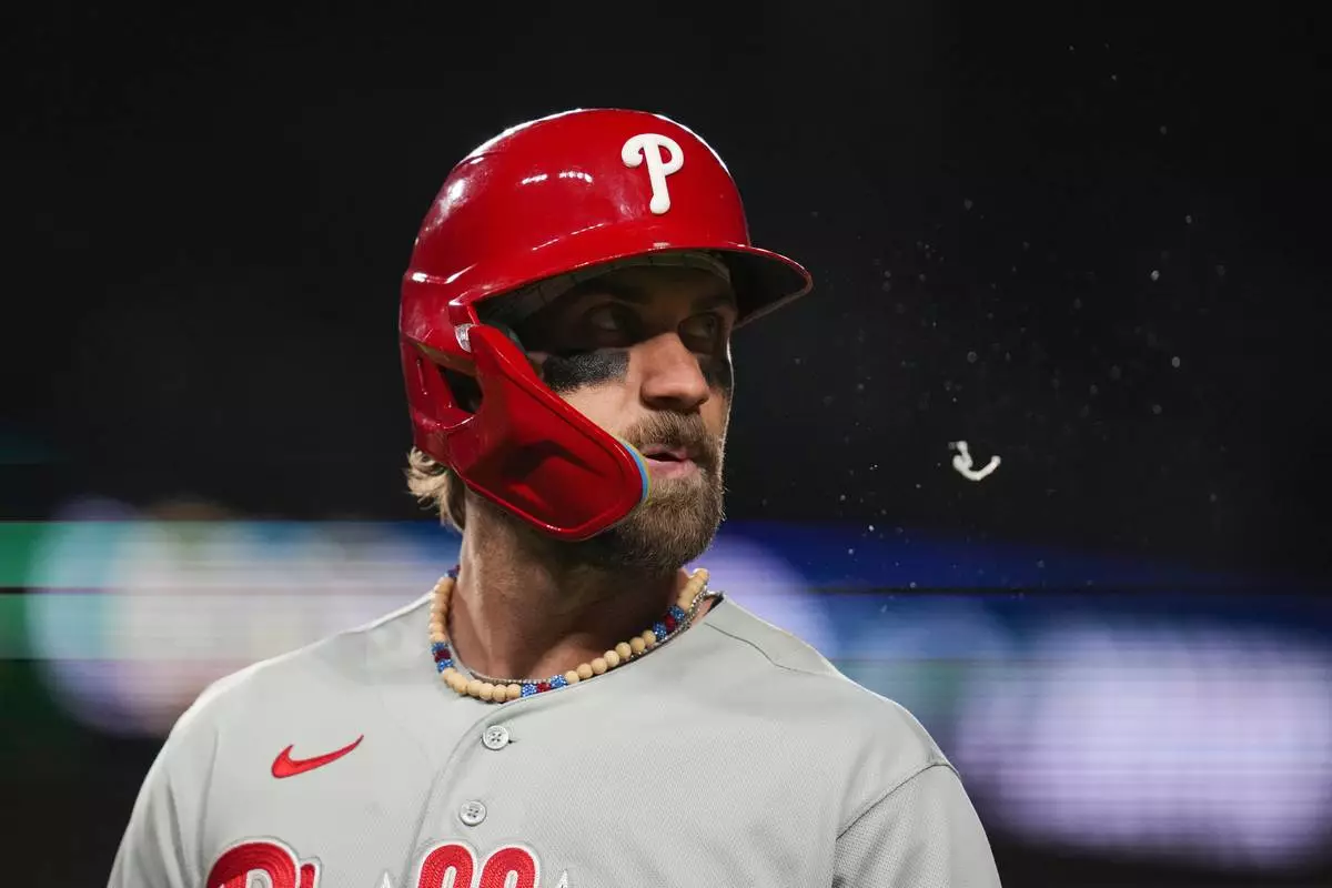 Philadelphia Phillies designated hitter Bryce Harper (3) returns to the dugout after grounding out during the eighth inning of a baseball game against the Chicago Cubs, Wednesday, April 22, 2026, in Chicago. (AP Photo/Erin Hooley)