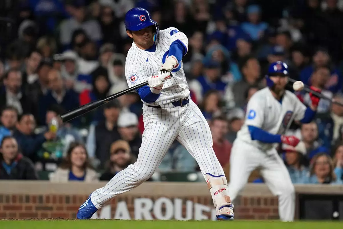 Chicago Cubs' Seiya Suzuki (27) hits a two-run home run during the fifth inning of a baseball game against the Philadelphia Phillies, Wednesday, April 22, 2026, in Chicago. (AP Photo/Erin Hooley)