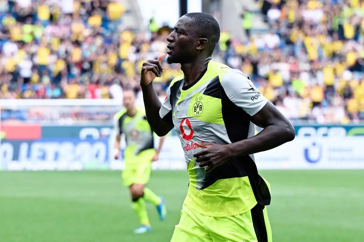 Dortmund's Serhou Guirassy celebrates after scoring during their German Bundesliga soccer match against TSG 1899 Hoffenheim in Sinsheim, Germany, Saturday, April 18, 2026. (Uwe Anspach/dpa via AP)