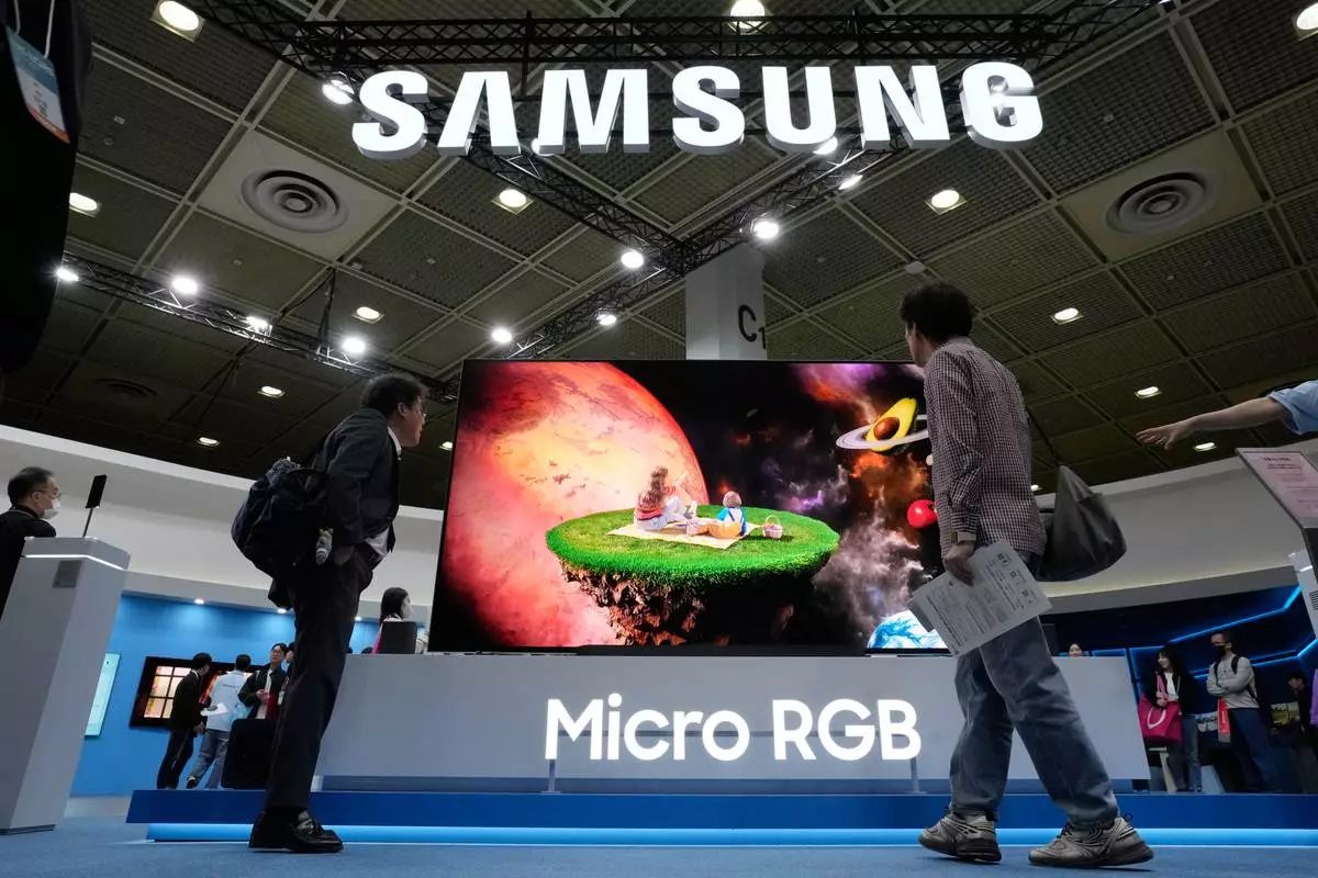 Visitors watch a Samsung Electronics' Micro RGB TV at its booth during the World IT Show in Seoul, South Korea, Wednesday, April 22, 2026. (AP Photo/Ahn Young-joon)
