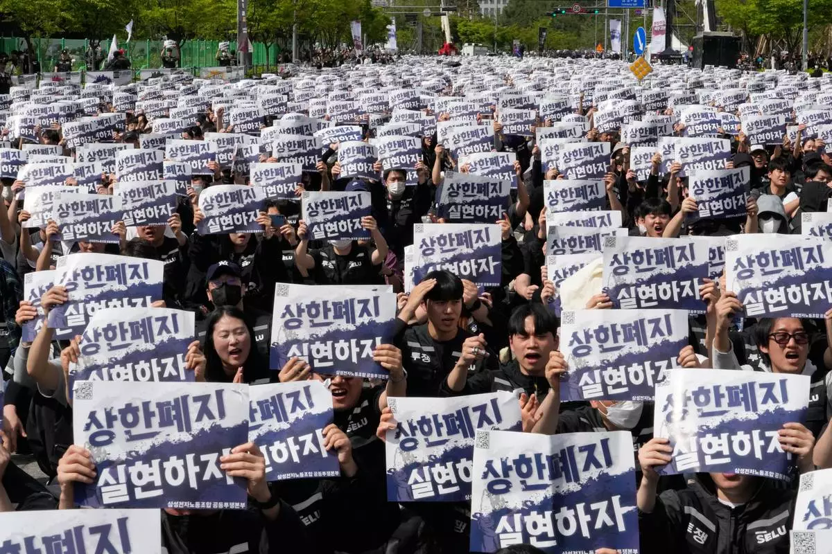 PYEONGTAEK, South Korea (AP) — Thousands of Samsung Electronics workers rallied Thursday at its computer chip complex in Pyeongtaek, South Korea, demanding higher bonuses and threatening to strike as booming demand for artificial intelligence drives up memory-chip profits.