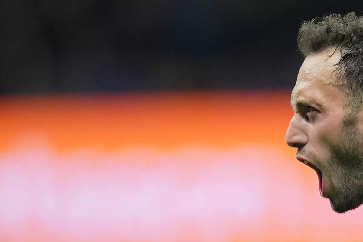 Inter Milan's Hakan Calhanoglu celebrates after scoring their second goal during the Italian Cup, second-leg soccer match between Inter Milan and Como, in Milan, Italy, Tuesday, April 21, 2026. (Spada/LaPresse via AP)