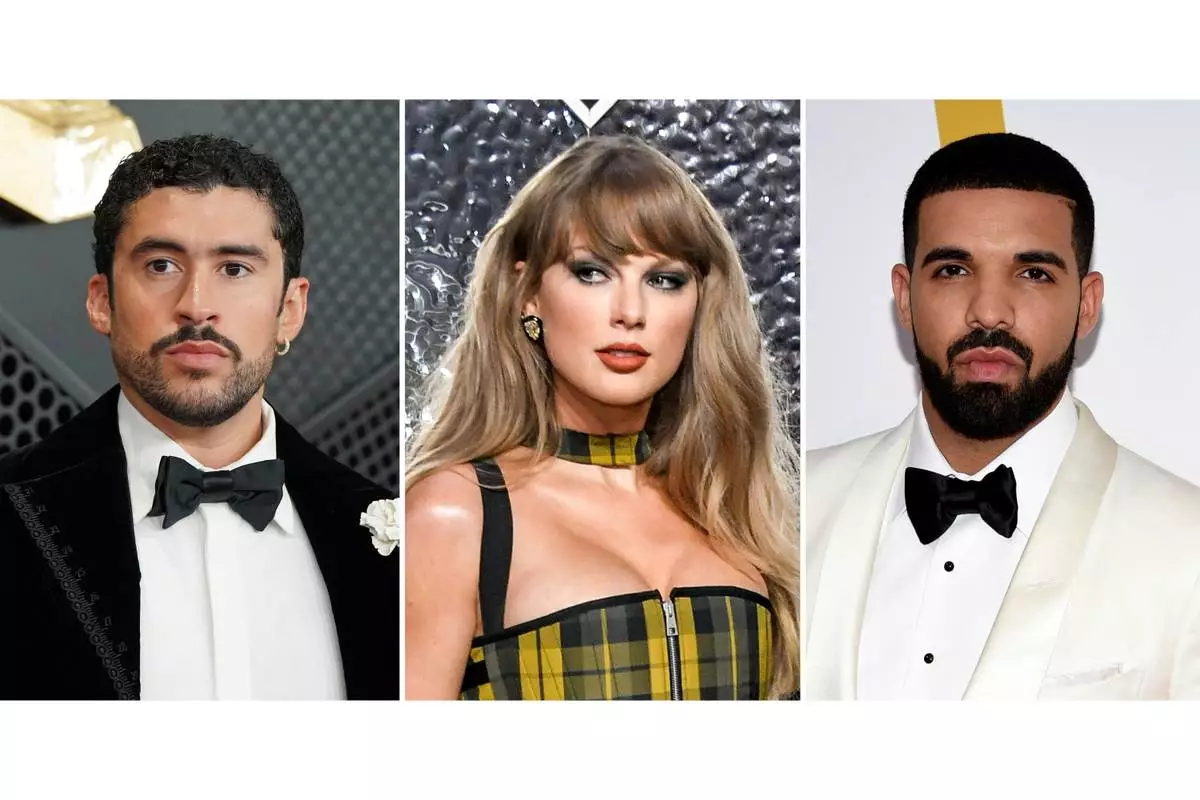 This combination of images show entertainers, from left, Bad Bunny, Taylor Swift and Drake. (AP Photo)