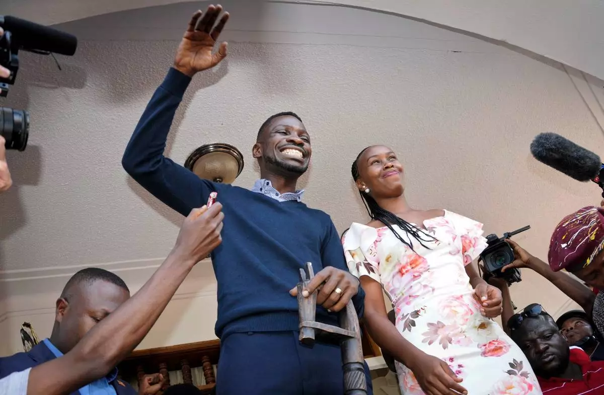 FILE -Pop star-turned-opposition lawmaker Bobi Wine, whose real name is Kyagulanyi Ssentamu, waves to supporters accompanied by his wife Barbara Itungo Kyagulanyi at his home in Kampala, Uganda, Sept. 20, 2018. (AP Photo/Ronald Kabuubi, File)