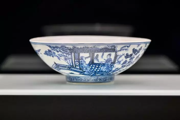 The "Blooming: The Art of Gardens in East and West" exhibition will be staged at the Hong Kong Museum of Art starting from tomorrow (April 24). Photo shows a bowl with a scene of ladies in a garden and in underglaze blue in the Ming dynasty from the collection of the Palace Museum in Beijing. Source: HKSAR Government Press Releases