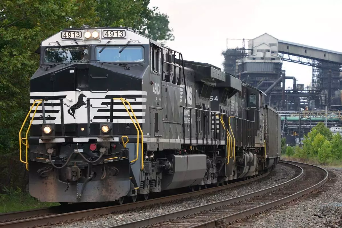 FILE - A Norfolk Southern freight train rolls past the U.S. Steel's Clairton Coke Works, in Clairton, Pa., Tuesday, Aug. 12, 2025. (AP Photo/Gene J. Puskar, File)