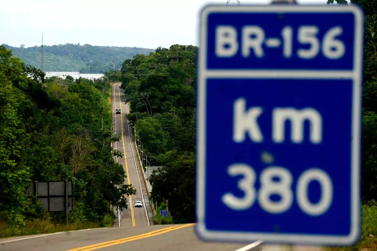 Vehicles drive on a fully paved section of BR-156 highway that connects the state capital Macapa with the city of Oiapoque, Amapa state, Brazil, Monday, March 9, 2026. (AP Photo/Eraldo Peres)