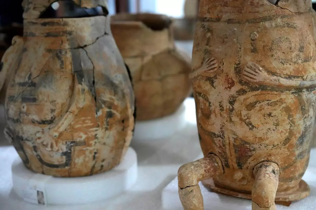 Pottery vessels with anthropomorphic features believed to be urns are displayed at the Institute for Scientific and Technological Research in Macapa, Amapa state, Brazil, Sunday, March 8, 2026. (AP Photo/Eraldo Peres)
