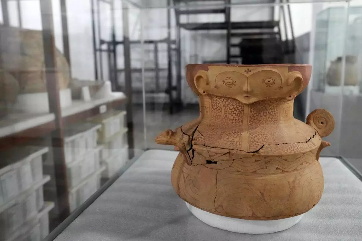 A pottery vessel with anthropomorphic features believed to be an urn is displayed at the Institute for Scientific and Technological Research in Macapa, Amapa state, Brazil, Sunday, March 8, 2026. (AP Photo/Eraldo Peres)